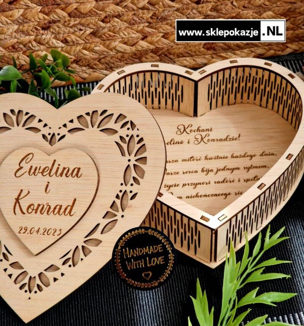 Piękne, ręcznie wykonane pudełko z drewna w kształcie serca to idealny prezent na ślub, rocznicę, urodziny, zaręczyny czy Walentynki. Precyzyjny grawer nadaje mu wyjątkowego charakteru, a możliwość personalizacji sprawia, że stanie się pamiątką na całe życie.
